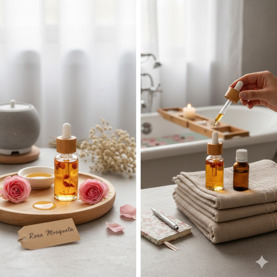 - ROSA MOSQUETA: Estratto per spremitura a freddo dei semi, è ricchissimo di acidi grassi polinsaturi (Omega 3 e 6) e vitamina A. È il trattamento d’elezione per la rigenerazione dei tessuti cutanei e il contrasto ai radicali liberi.